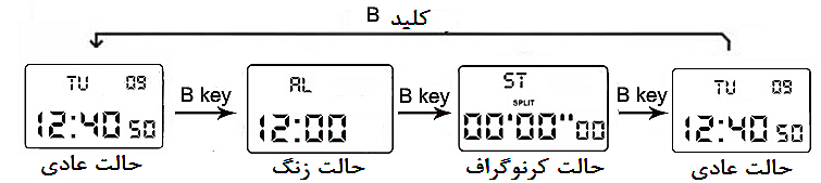 - در حالت نمایش عادی، برای ورود به حالت ساعت زنگدار کلید B را فشار دهید.