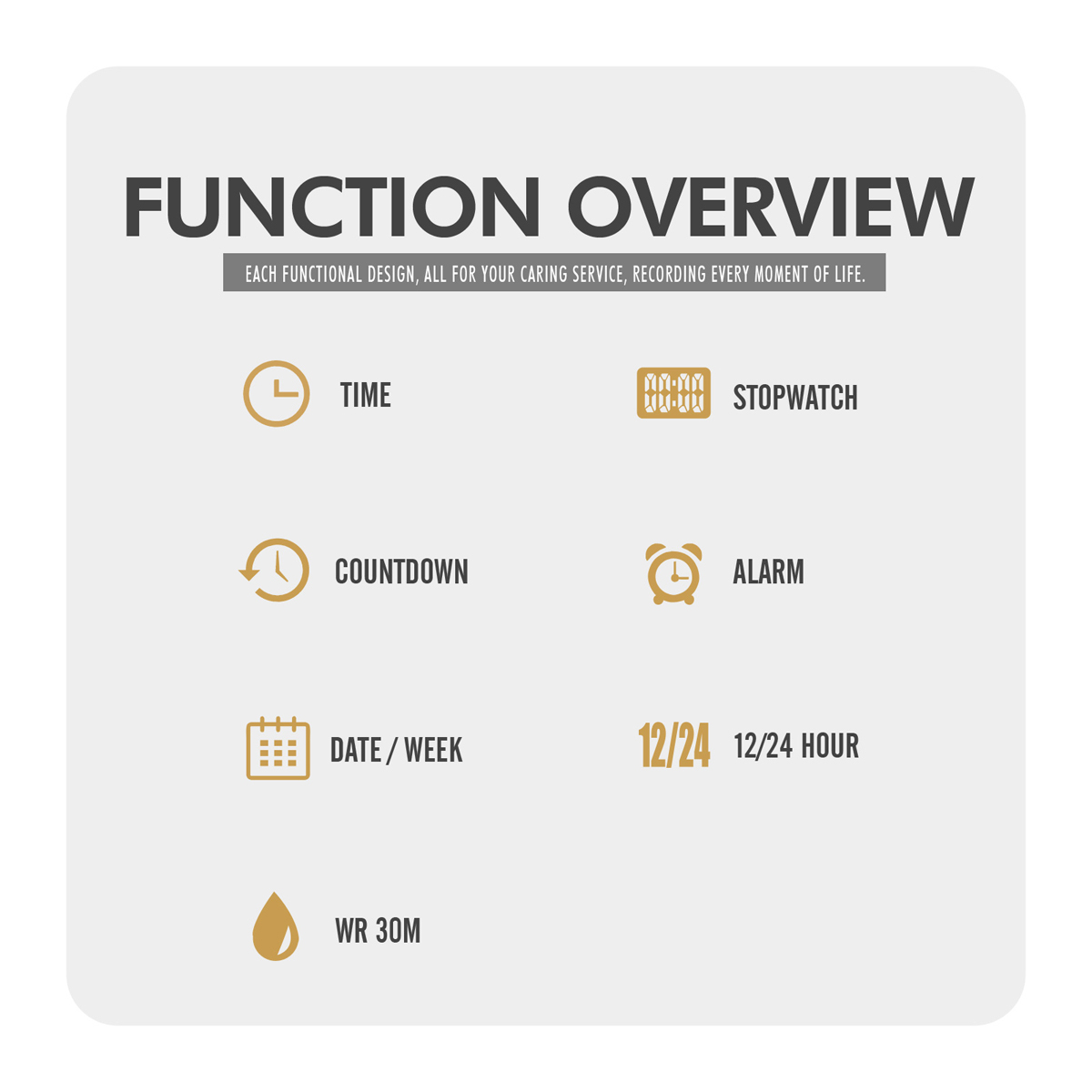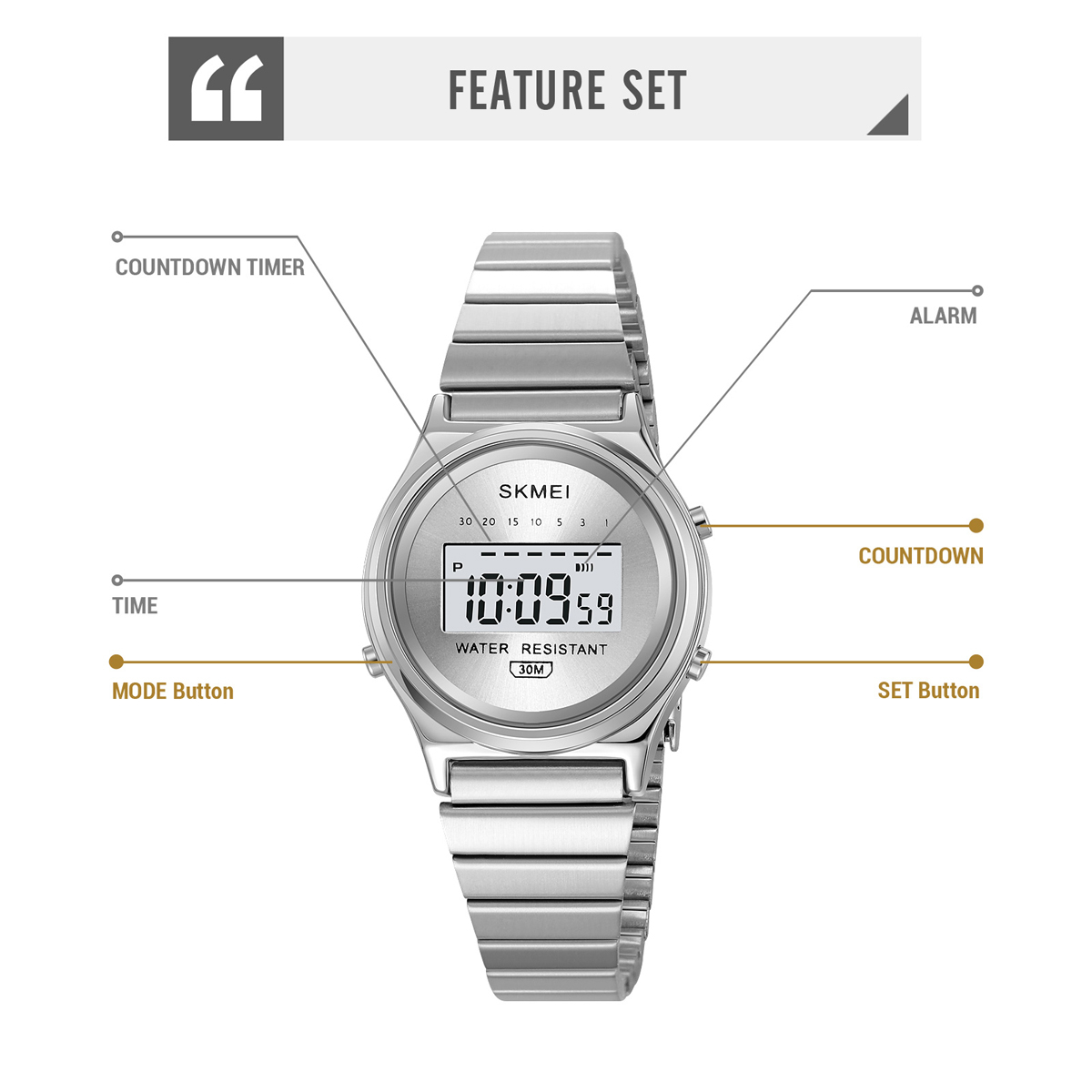 | ویژگی | تاریخ شمار, تایمر (شمارش معکوس), زمان سنج, زنگ هشدار (آلارم), قابلیت نمایش 12 و 24 ساعته, هفته شمار, کرونومتر |