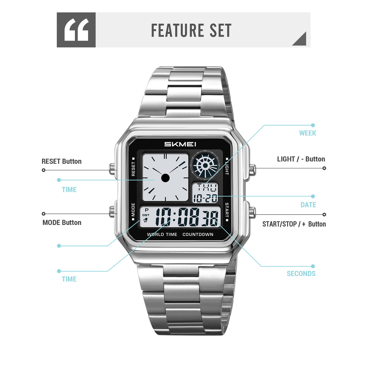 ویژگیتاریخ شمار, تایمر (شمارش معکوس), زنگ هشدار (آلارم), ساعت تابستانی, قابلیت نمایش 12 و 24 ساعته, نور پس زمینه ال ای دی, هفته شمار