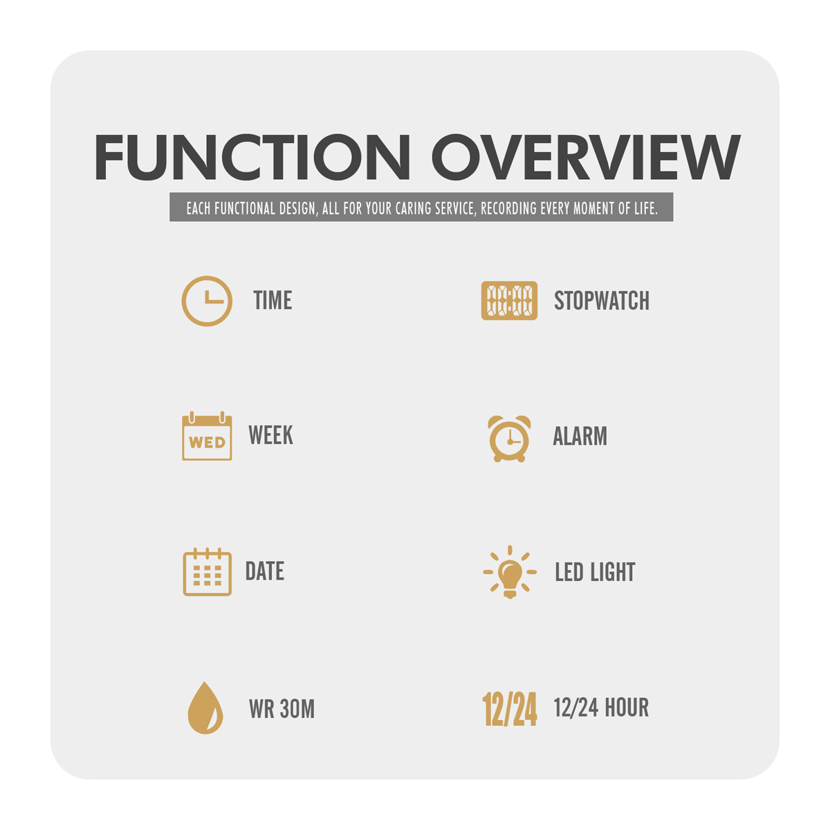 ویژگیتاریخ شمار, زمان سنج, زنگ هشدار (آلارم), قابلیت نمایش 12 و 24 ساعته, نور پس زمینه ال ای دی, هفته شمار, کرونومتر