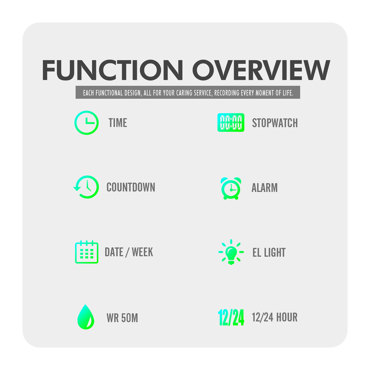 | ویژگی | تاریخ شمار, تایمر (شمارش معکوس), زمان سنج, زنگ هشدار (آلارم), قابلیت نمایش 12 و 24 ساعته, نور پس زمینه ال ای دی, هفته شمار |