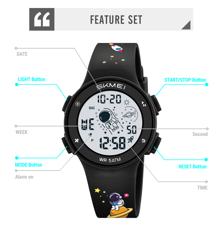| ویژگی | تاریخ شمار, روز شمار, زمان سنج, زنگ هشدار (آلارم), قابلیت نمایش 12 و 24 ساعته, نور پس زمینه ال ای دی, هفته شمار |